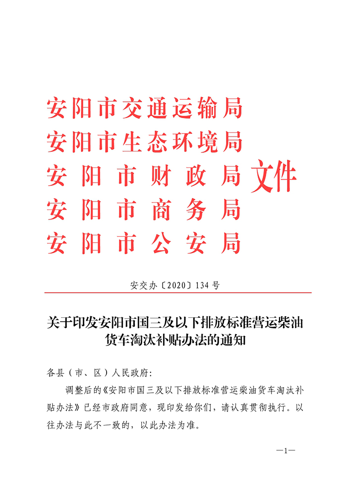 關于印發《安陽市加快淘汰國三及以下排放標準營運柴油貨車工作推進方案》的通知