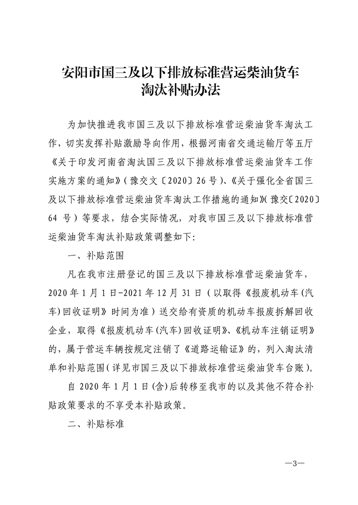 關于印發安陽市國三及以下排放標準營運柴油貨車淘汰補貼辦法的通知